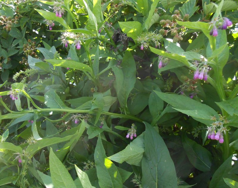 Also known as knitbone, Symphytum is a genus of flowering plants in the borage family, Boraginaceae. There are up to 35 species, known by the common name comfrey.Several species and hybrids, particularly S. officinale and S. × uplandicum, are used in gardening and herbal medicine. Folk medicine names for comfrey include knitbone, boneset, and the derivation of its Latin name Symphytum (from the Greek symphis, meaning growing together of bones, and phyton, a plant), referring to its ancient uses. Similarly, the common French name is consoude, meaning to weld together. The tradition in different cultures and languages suggest a common belief in its usefulness for mending bones. Comfrey contains mixed phytochemicals in varying amounts, including allantoin, mucilage, saponins, tannins, pyrrolizidine alkaloids, inulin, and proteins, among others. Liver toxicity is associated with consuming this plant or its extracts. In modern herbalism, comfrey is most commonly used topically. In 2001, the United States Food and Drug Administration issued a ban of comfrey products marketed for internal use, and a warning label for those intended for external use.Comfrey is particularly contraindicated during pregnancy and lactation, in infants, and in people with liver, kidney, or vascular diseases.