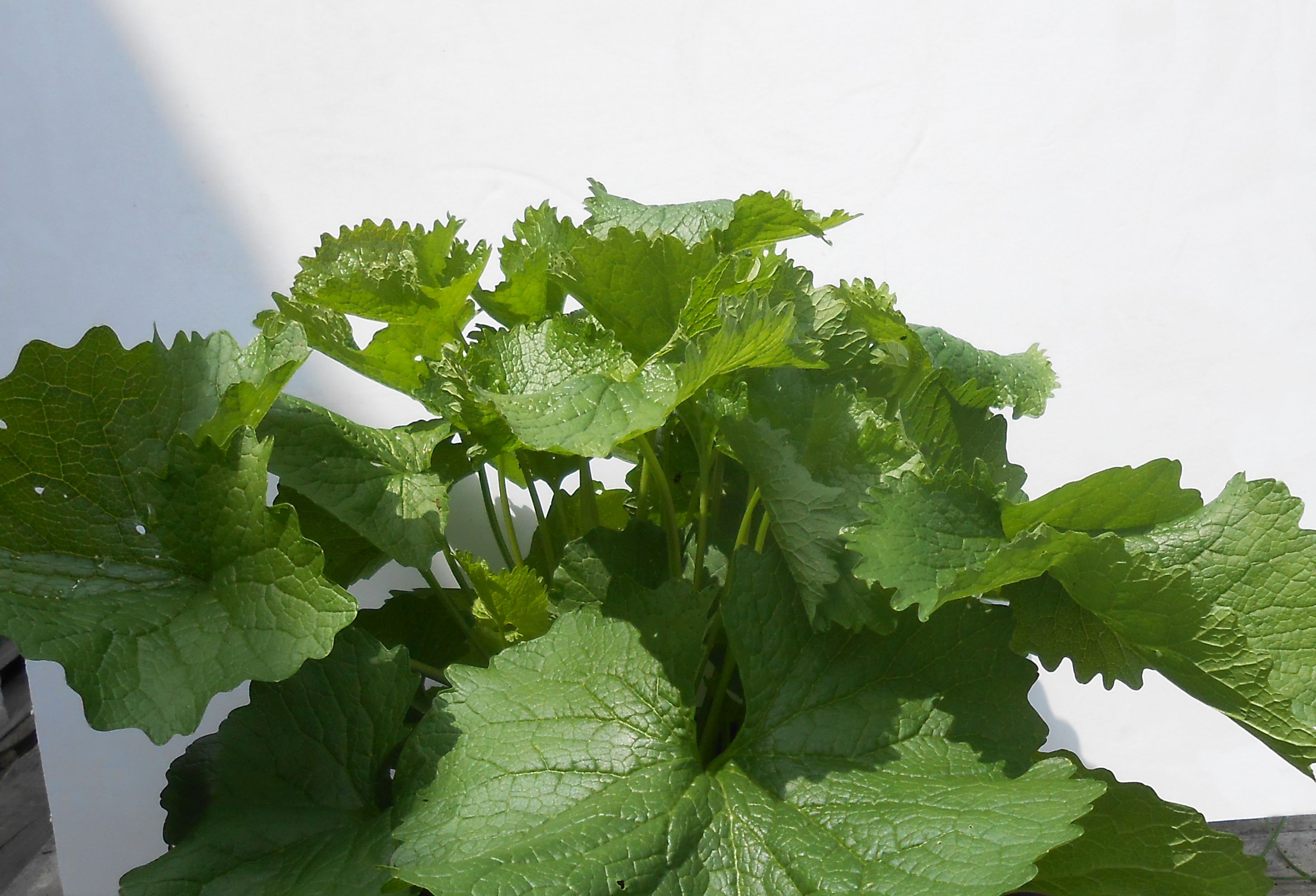 Garlic root, hedge garlic, sauce-alone, jack-in-the-bush, penny hedge and poor man's mustard It is a herbaceous biennial plant growing from a deeply growing, thin, whitish taproot scented like horseradish. In their first years, plants are rosettes of green leaves close to the ground; these rosettes remain green through the winter and develop into mature flowering plants the following spring. Second-year plants often grow from 30–100 cm (12–39 in) tall, rarely to 130 cm (51 in) tall. The leaves are stalked, triangular through heart shaped, 10–15 cm (3.9–5.9 in) long (of which about half being the petiole) and 5–9 cm (2.0–3.5 in) broad, with coarsely toothed margins. The flowers are produced in spring and summer in small clusters. Each small flower has four white petals 4–8 mm (0.2–0.3 in) long and 2–3 mm (0.08–0.12 in) broad, arranged in a cross shape. The fruit is an erect, slender, four-sided capsule 4–5.5 cm (1.6–2.2 in) long, called a silique, green maturing to pale grey brown, containing two rows of small shiny black seeds which are released when a silique splits open. A single plant can produce hundreds of seeds, which often scatter several meters from the parent plant.