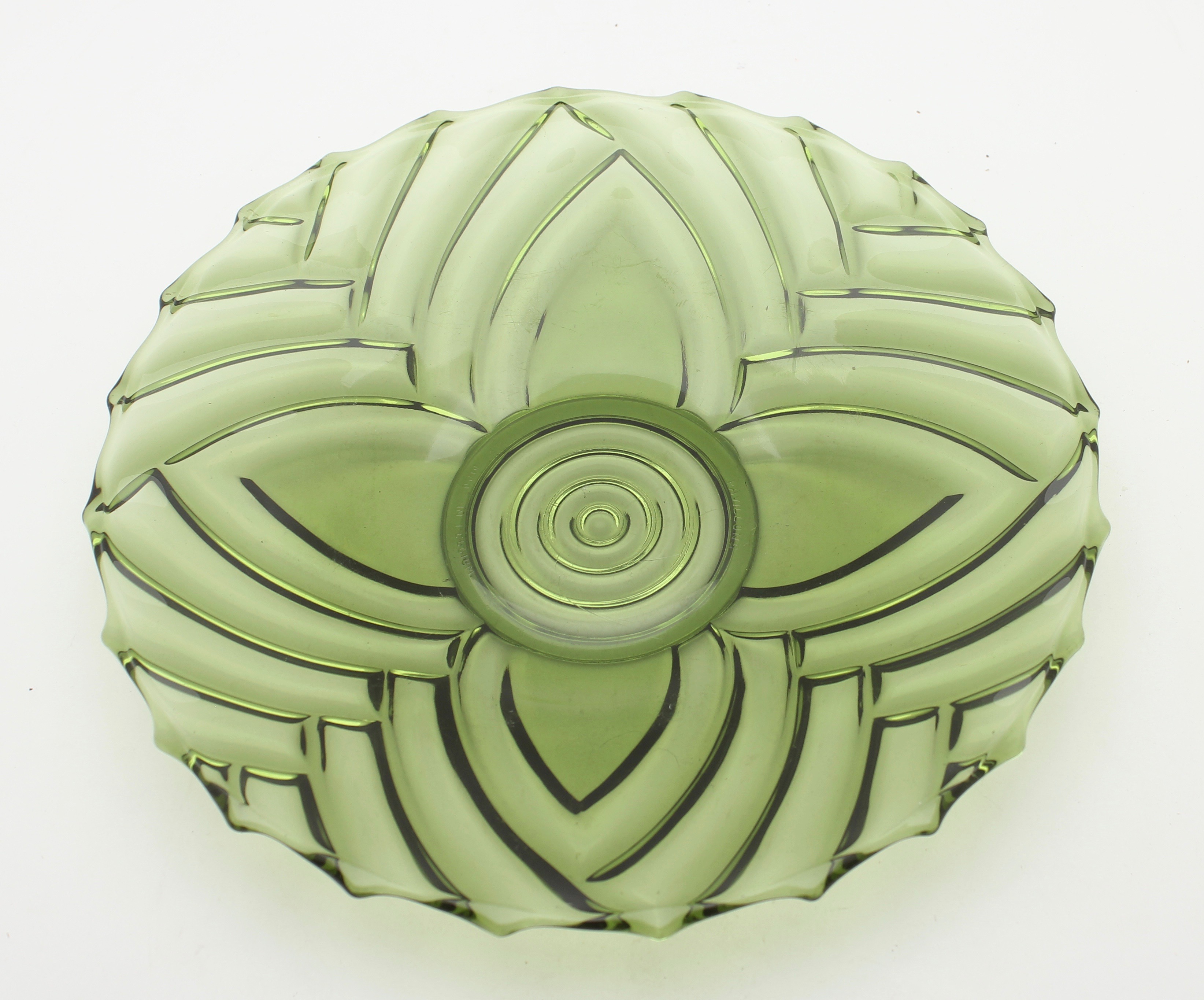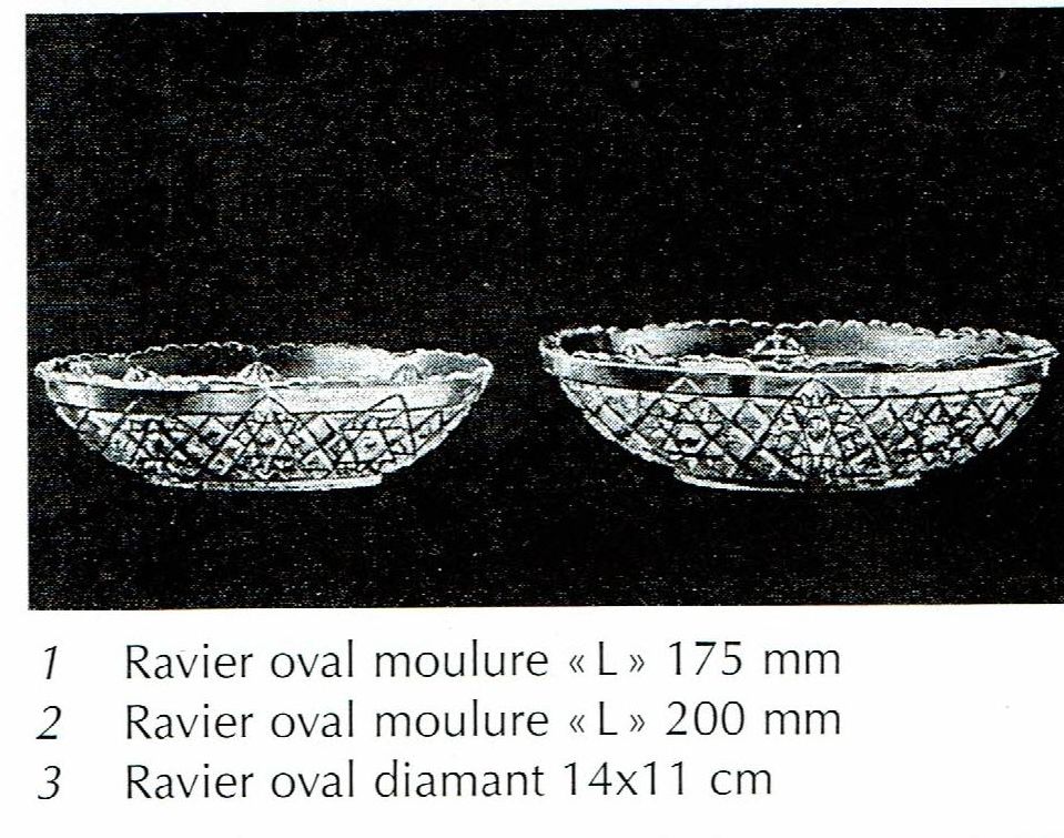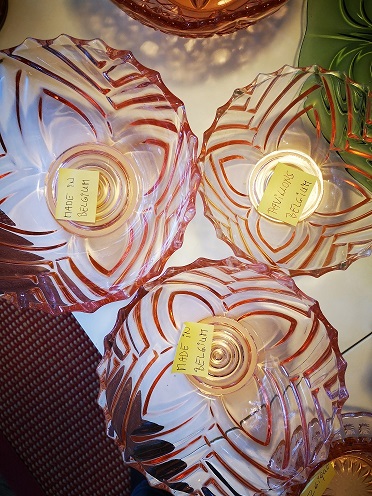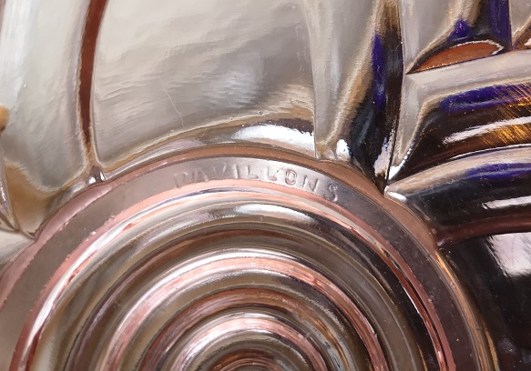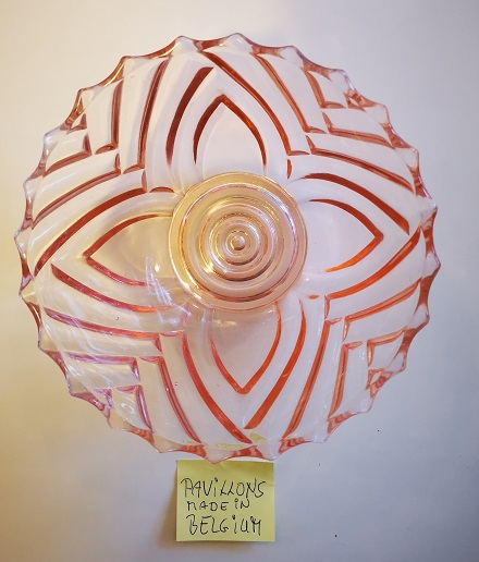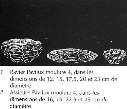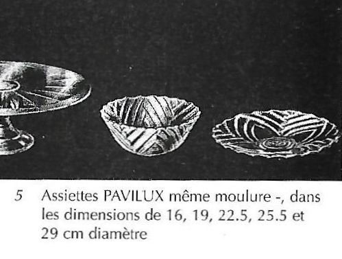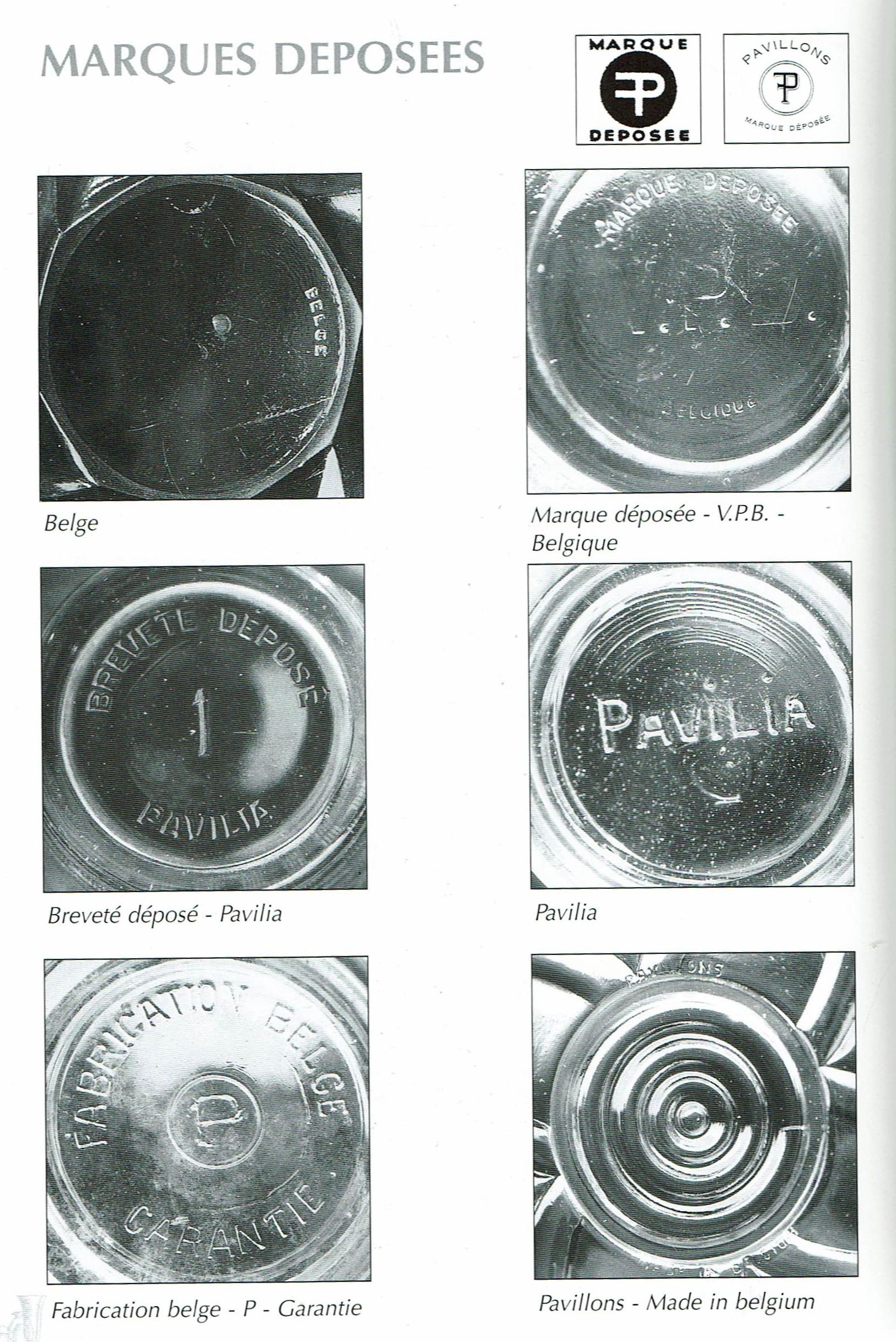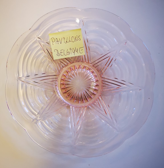 Cristalleries de Manage/Pavillons(Manage, 1880-1973) Gobeleteries & Cristalleries du Centre, a Manage changed their name in 1885 to Cristalleries de Manage and became part of the Pavillons company (who also owned the Verreries de Beignée in Ham-sur-Heure) from 1924-1954. They produced mostly pressed glass and bottles in Beignée, whie Manage focussed on blown-glass and gobleterie. After a slump in 1951, it was sold Durobor in 1954 and continued making blown glass until 1973. Verreries & Bouteilleries de Beignée/Pavillons (Ham-sur-Heure,1922-1957) Founded 1911, became Pavillons in 1922 and then took over Cristalleries de Manage in 1924. Mainly produced pressed glass and bottles in Beignée (while crystal and blown glass was mostly produced in Manage, 25 km away).The site stopped production in 1954. In an article by Michèle Thiry (2002), the registered trademarks include 'Belge', 'VPB Belgique' 'Pavilia', 'Fabrication Belge Garantie' (with P-logo in a round frame), and 'Pavillons - Made in Belgium'. Although the factory is known to have produced pressed glass, there was no information available which allowed collectors to identify examples of their work. Recent research has led to some new discoveries. With help from Pamela Wessendorf and Eliane Bragard we've started to trace items which reveal the range of designs that were made in this factory. It appears that Pavillon's pressed glass was mostly executed at the Verreries de Beignée in Ham-sur-Heure, 25 km south of the sister factory in Manage.It is sometimes marked VPB, PAVILLONS, PAVILIA or PAVILUX. Their identified marks on pressed glass include 'FABRICATION BELGE' and 'BELGE' which had been noted as a common and hithertoe puzzling mark as well as FAIT EN BELGIQUE and MADE IN BELGIUM . It is not yet clear how many other patterns from our 'Belge Marks' page we will be able to move onto this page as the history unfolds. The patterns shown on this page have also been identified from literature and/or have marks which clearly identify them. |